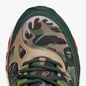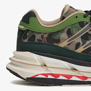 Upper textil con gráfico camo característico de BAPE, combinado con refuerzos sintéticos para mayor soporte. Entresuela con amortiguación y suela de goma para tracción.