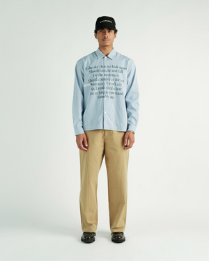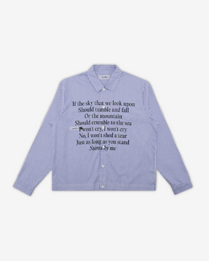 La Riverton L/S Stripe Button-Up destaca por su enfoque conceptual y minimalista. Una camisa de rayas clásica elevada con un gráfico serigrafiado que incorpora letras del tema “Stand By Me” (1962), fusionando música, nostalgia y diseño.