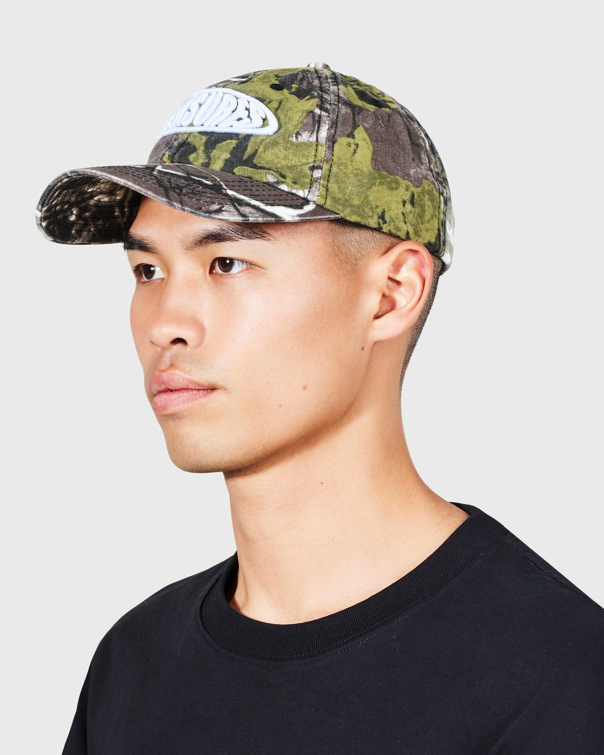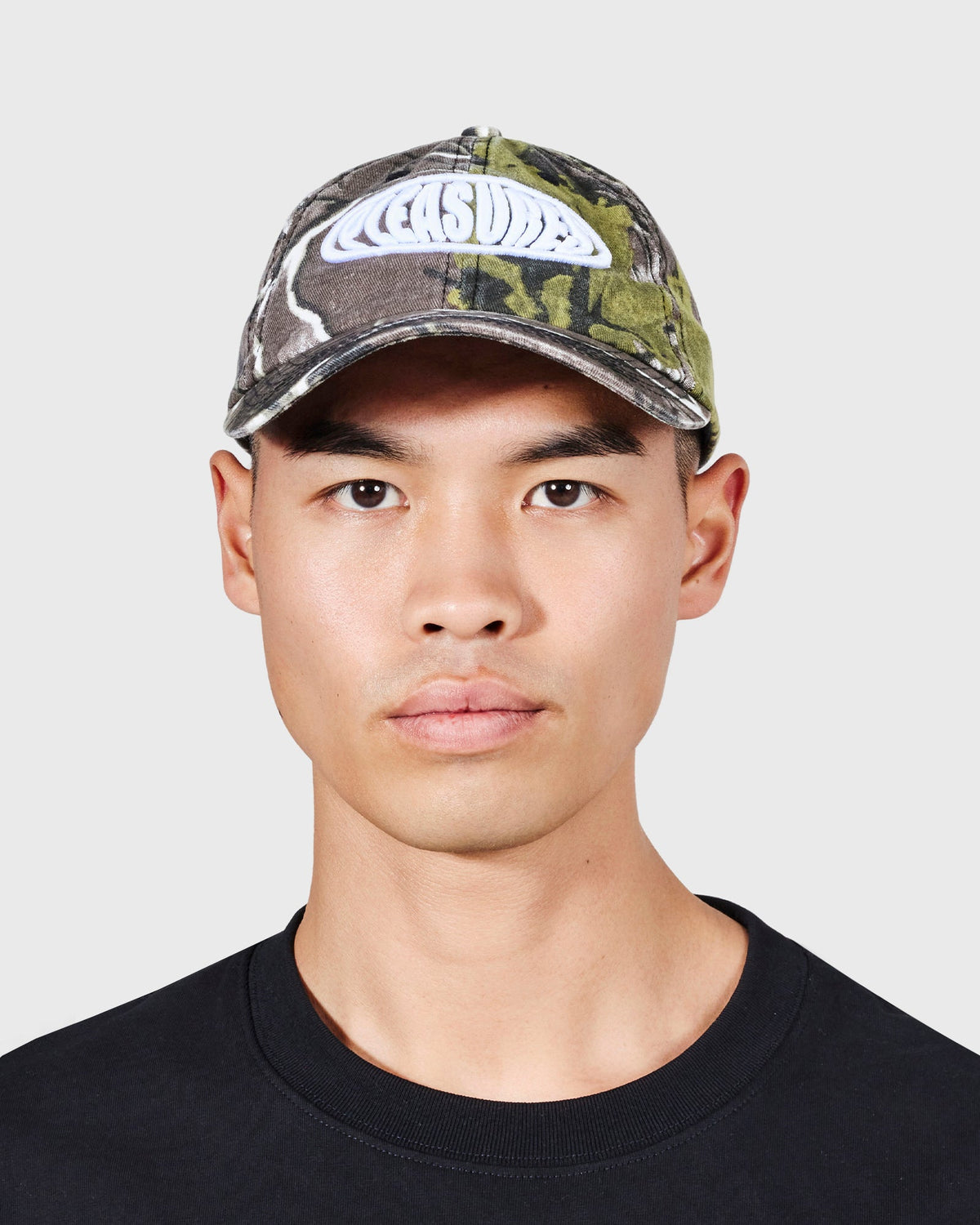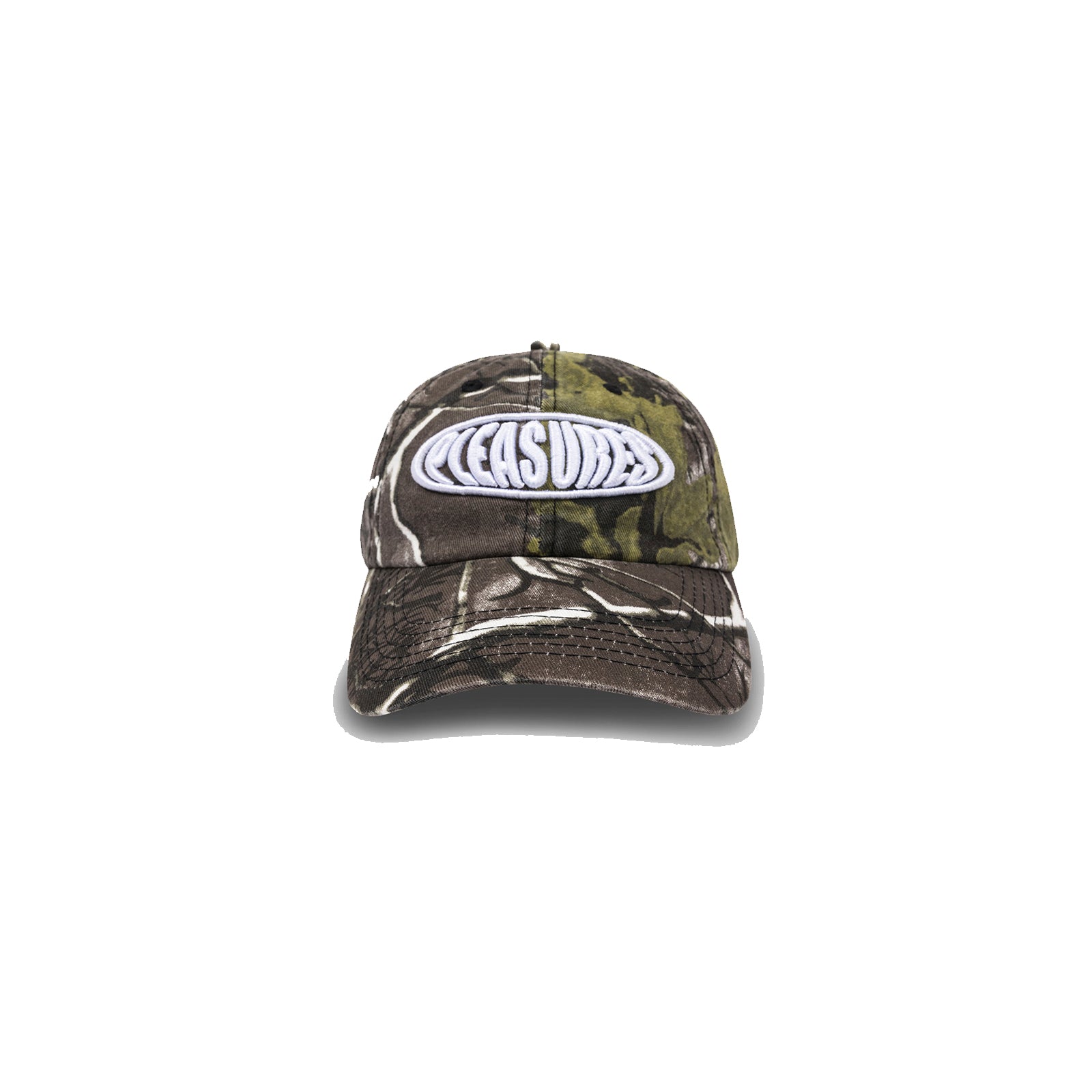 La clásica gorra estilo polo de Pleasures con un patrón camo en tonos verdes y marrones y el logo Bubble bordado en relieve al frente. Un accesorio versátil que aporta un look audaz y urbano.